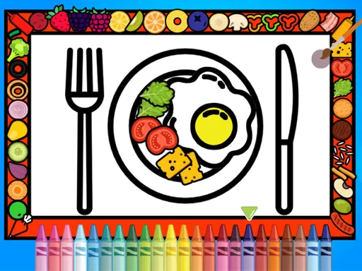 Cooking and meal preparing themed coloring game for kids with 4 different coloring pages that will encourage them to learn how to draw within the lines. Also kids can have fun adding colorful vegetable and fruit stickers to decorate their art.